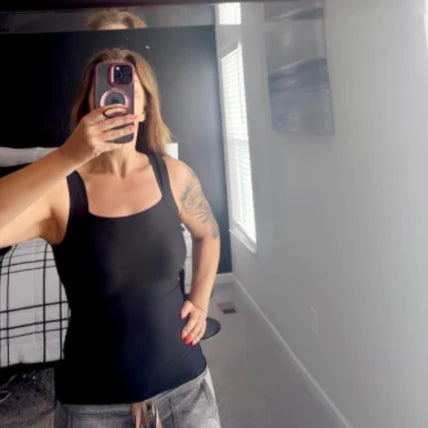Our first tank top with real built-in bra support. No wires, no extra layers, no lines showing through your clothes. One piece that does it all. Features removable padding for customisable coverage and a smoothing sculpt fit that defines your shape without squeezing. Works for everything from lounging to errands to the office. Comfortable enough to forget you're wearing it.